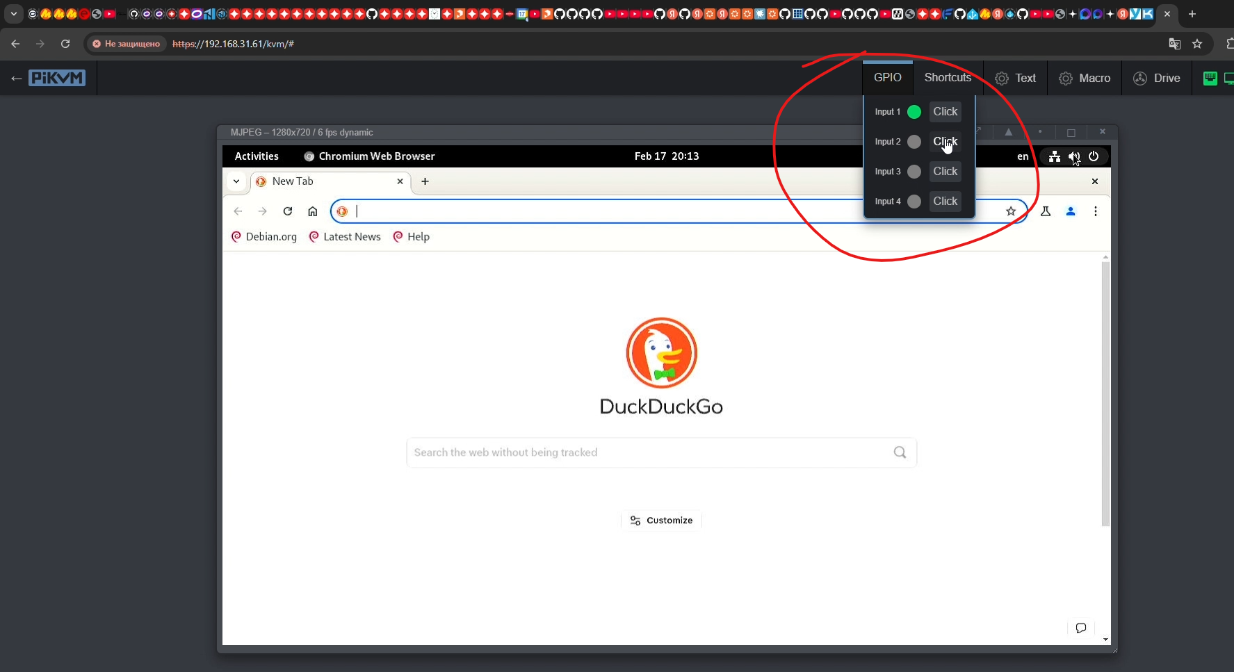 По итогу в web интерфейсе появится дополнительный блок “GPIO” и в нём будет 4 кнопки, которые переключают KVM: