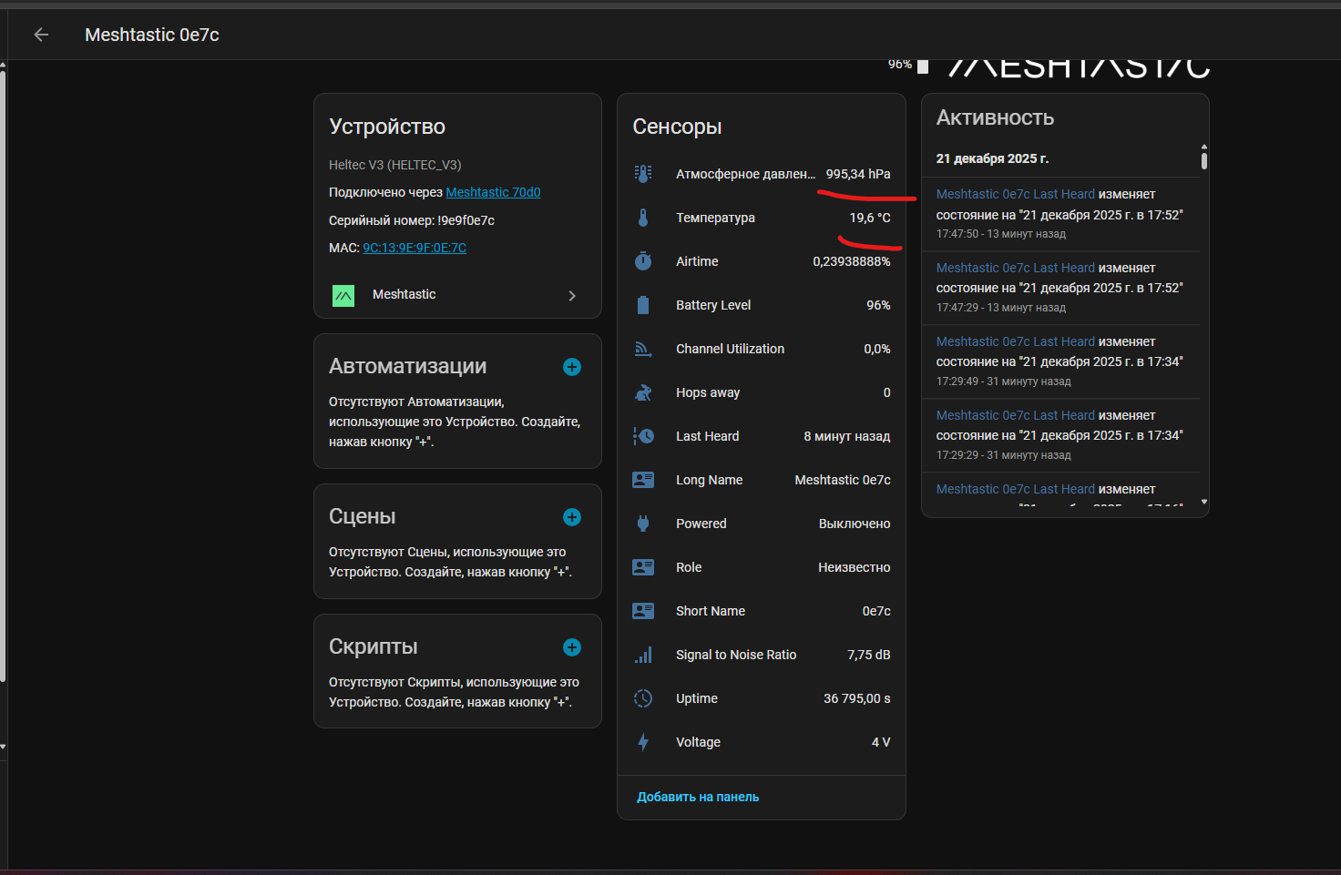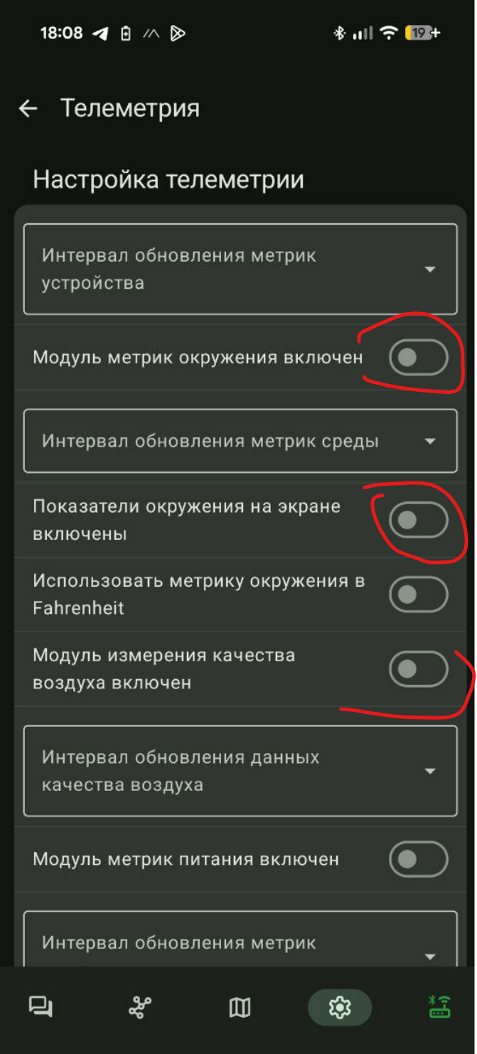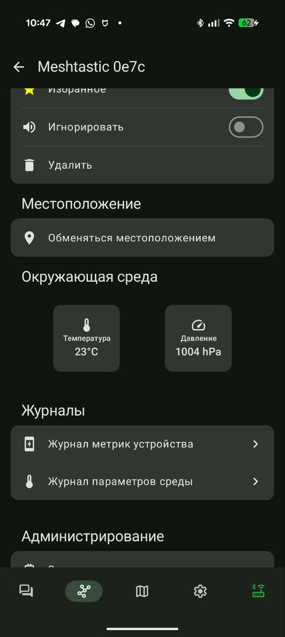 Показания этих датчиков видны как в приложении Meshtastic, так и другим людям, которые видят вашу Ноду.