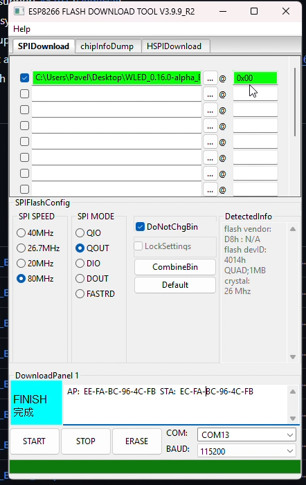 Прошить прошивку WLED лучше всего программой Flash Download Tool. И скачать её можно отсюда: https://docs.espressif.com/projects/esp-test-tools/en/latest/esp8266/production_stage/tools/flash_download_tool.html