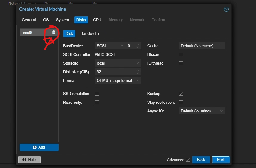После этого Unused Disk 0 пропадёт и появится “Hard Disj (virtio0)“.