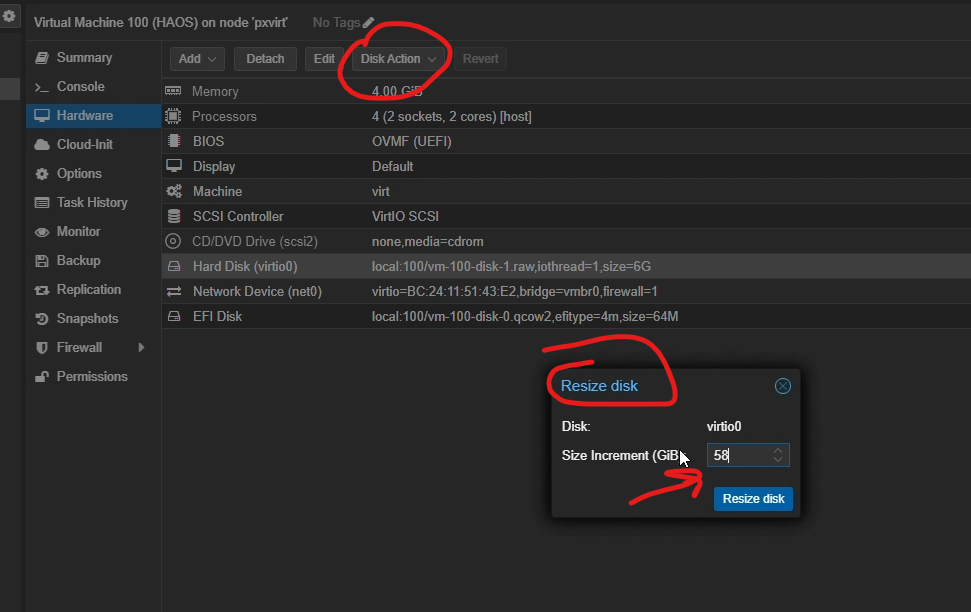 Но диск всего на 6GB, по этому лучше выделить его, нажать Disk Action -> Resize и добавить ему гигабайтов с вашего хранилища.