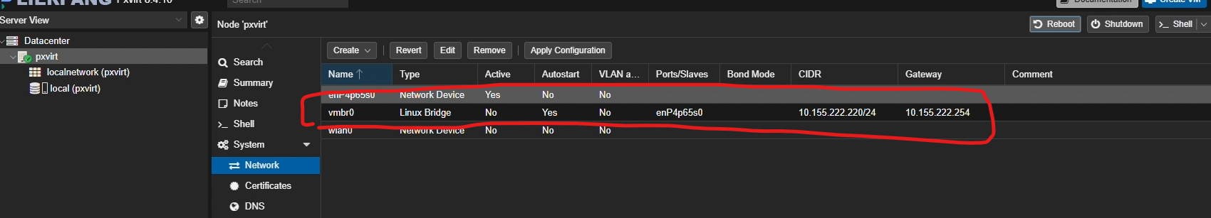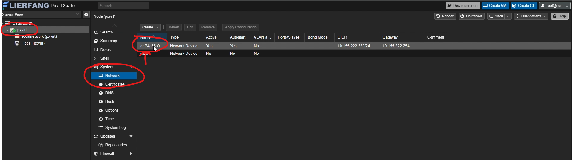 Но нужно еще провести настройки сети в самом web интерфейсе PXVIRT.