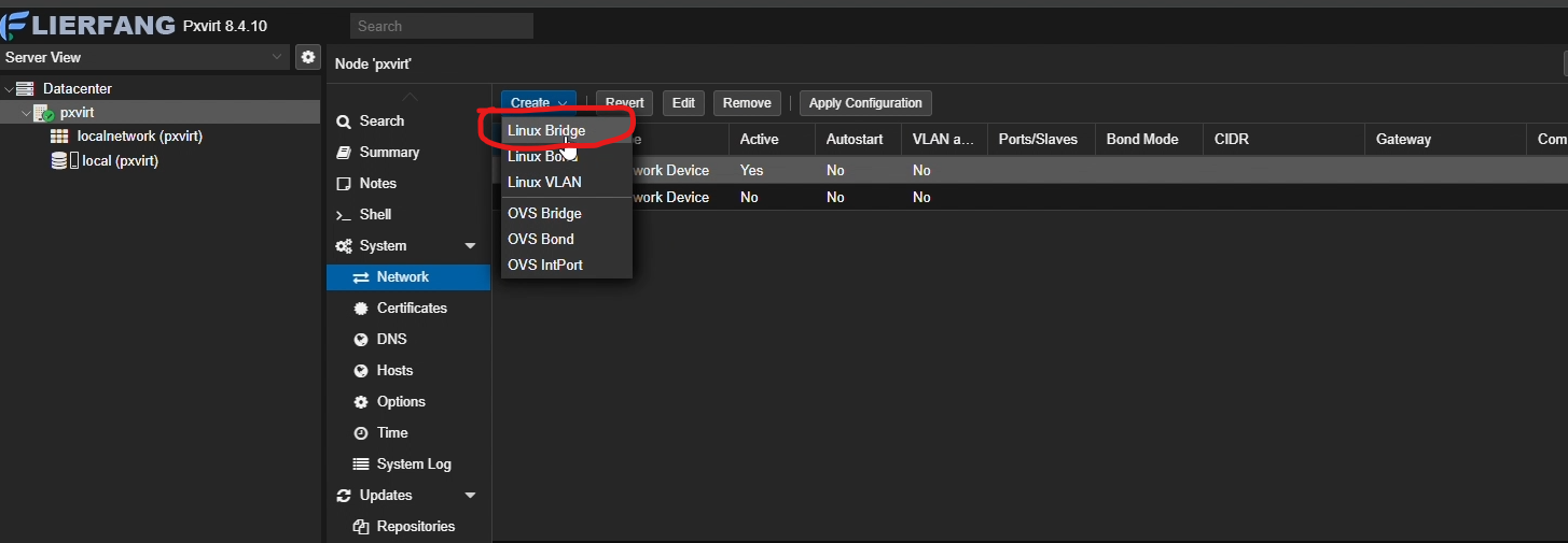 Далее создаём новый интерфейс кнопкой Create -> Linux Bridge: