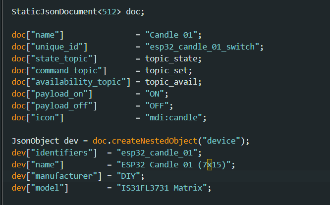 - name: "Магическая свеча" unique_id: esp32_candle_01_switch command_topic: "hmd/switch/esp32_candle_01/set" state_topic: "hmd/switch/esp32_candle_01/state" payload_on: "ON" payload_off: "OFF" state_on: "ON" state_off: "OFF" optimistic: false qos: 1 retain: true device: identifiers: ["esp32_candle_01"] name: "Магическая свеча" manufacturer: "DIY" model: "ESP32-C3 Candle“